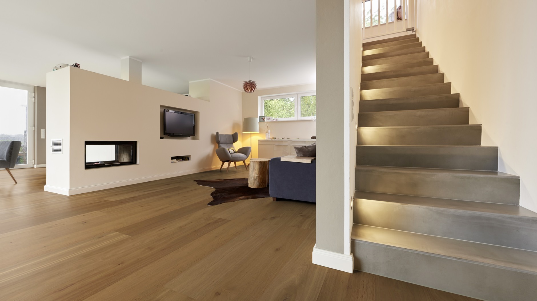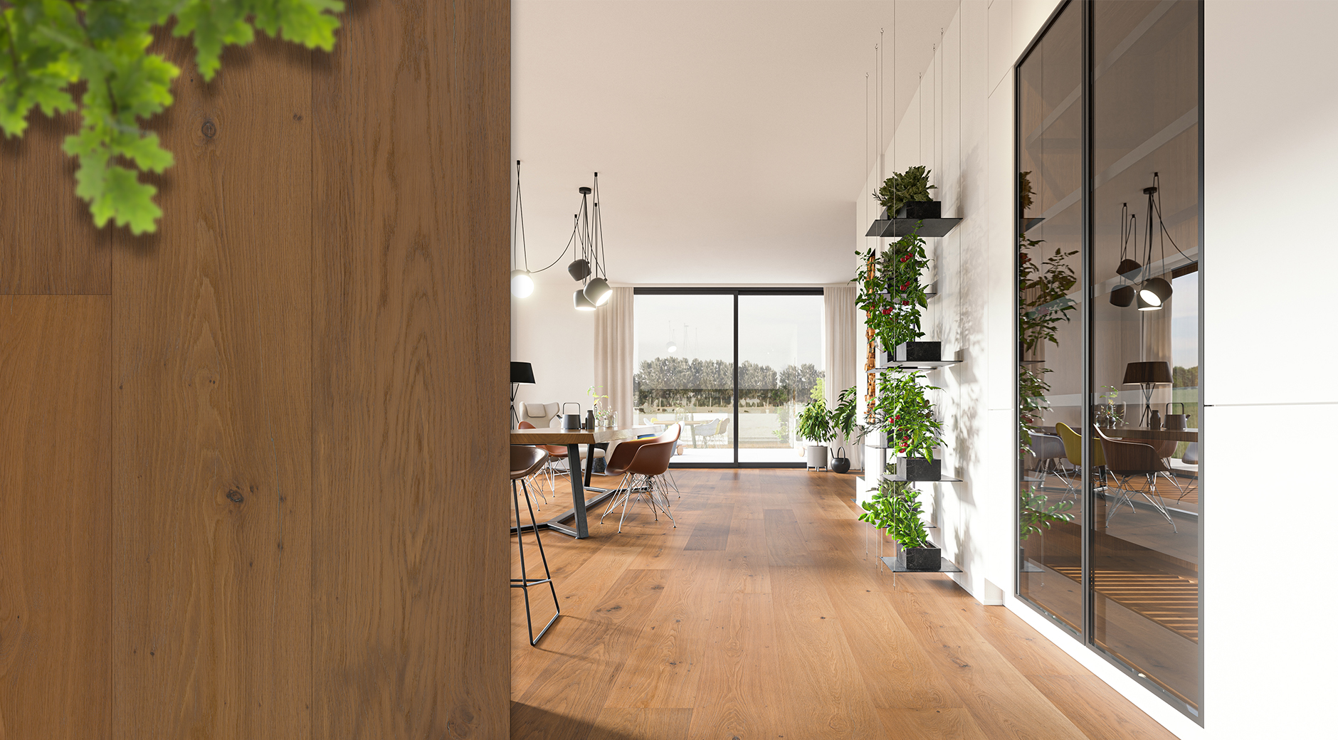 Plăcile late fac o cameră să pară mai mare, deoarece creează o linie continuă și puternică în întreaga încăpere. Acest aspect este deosebit de popular în casele cu concept deschis, unde poate crea iluzia unui spațiu mare, mai degrabă decât a mai multor camere.